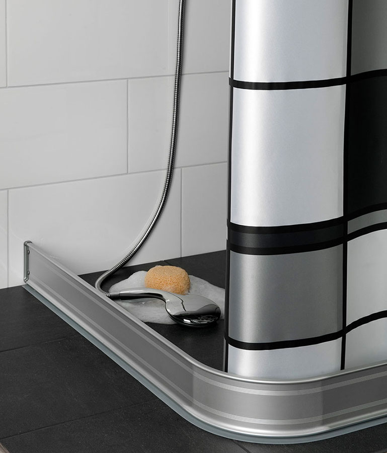 BYGGBESLAG | Duschsarg BB44 är en enkel men smart lösning som håller vattnet på sin plats vid dusch. Detta genom sin effektiva gummitätningslist. Duschsargen som är i 90-graders modell kan man sedan lätt ställa upp mot väggen när inte duschen används. BB44 finns i färgerna vit pulverlack och naturanodiserad aluminium. Sargen finns att få i flera olika modeller som vinklad, U-formad eller rak. Den raka modellen finns med liten kantvinkel som gör att den ska stå själv eller med en helt rak profil som då används tillsammans med väggfäste. Obs! Avvikande bild på vit duschsarg, ändskydd är vita i verkligheten.