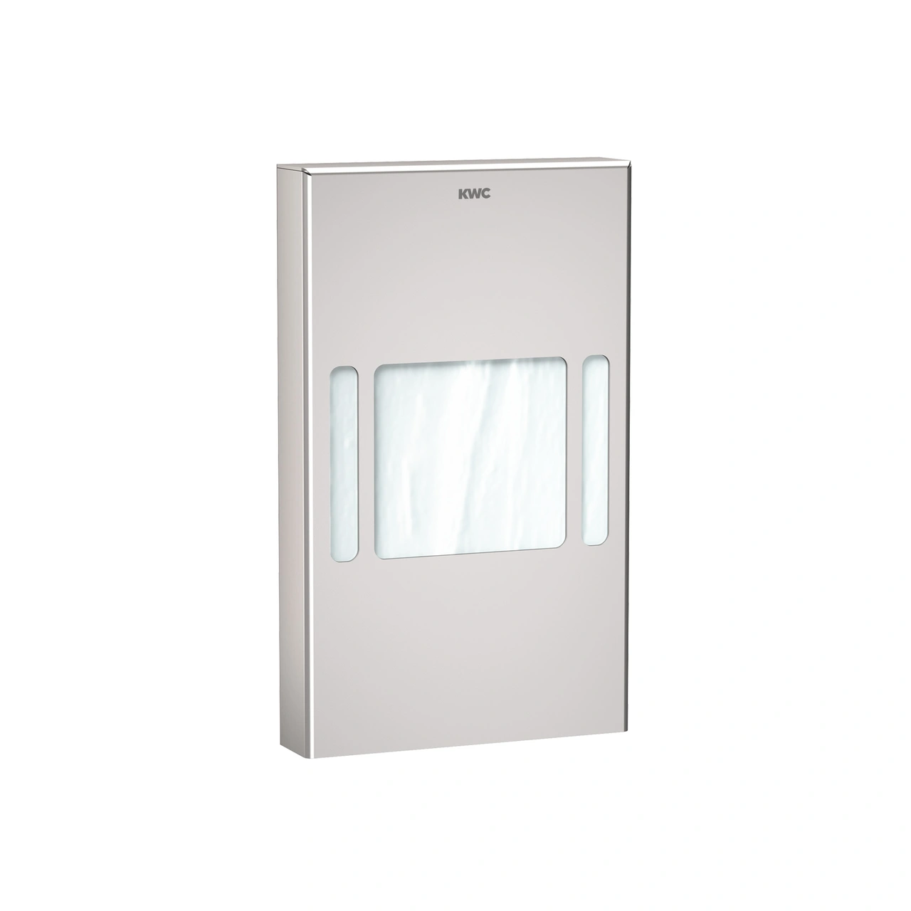 KWC | Sanitetspåsbehållare för väggmontering i borstad rostfritt stål med invändig klämma för att hålla paketet på plats. Inklusive förmonterad dubbelhäftande tejp, putstrasa för rengöring av limytan, skruvar i rostfritt stål och plugg.