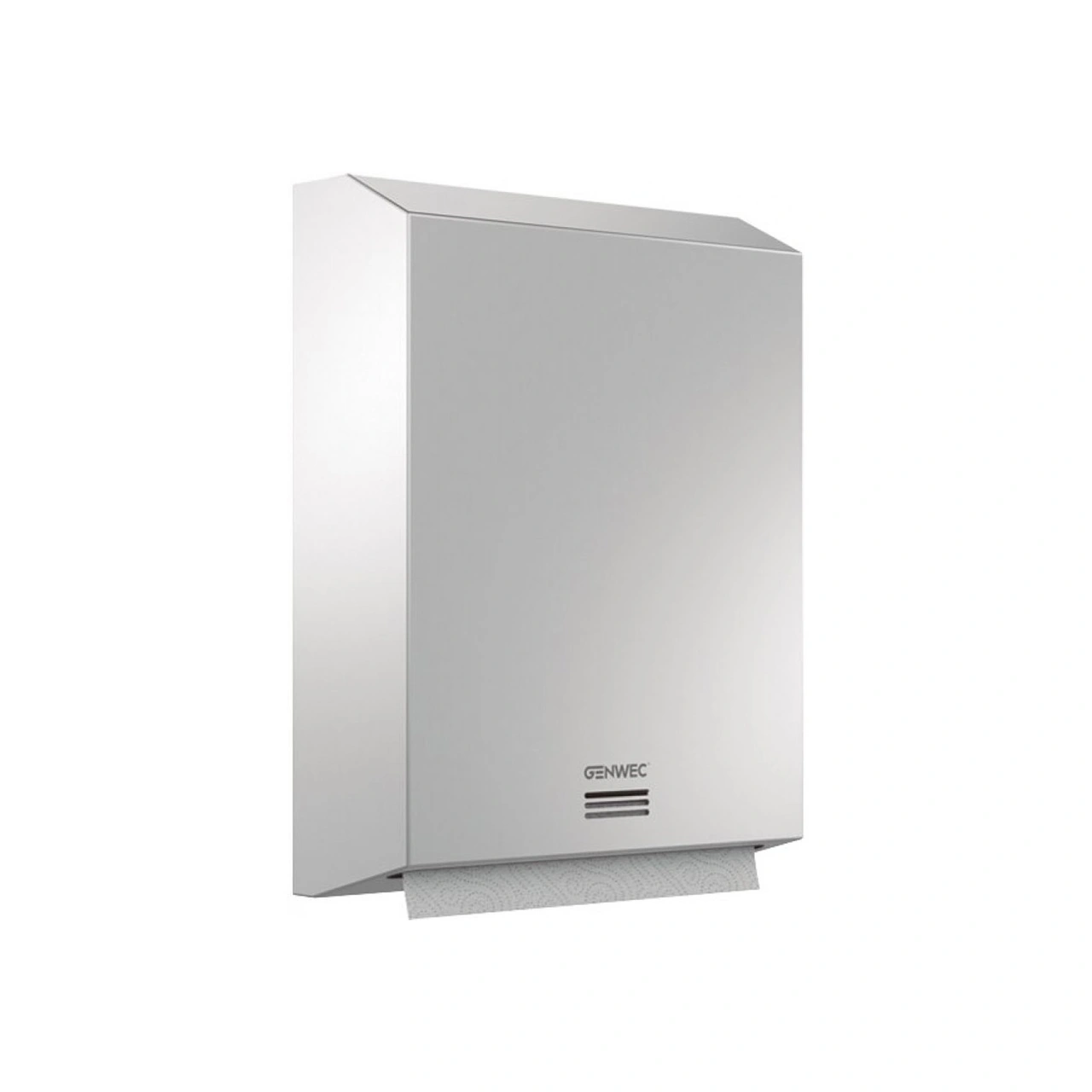 BESLAG DESIGN | Handduksskåp i serie Stay för offentliga badrumsmiljöer, borstad rostfri. De vertikala öppningarna avslöjar nivån på pappersinnehållet inuti dispensern. Levereras komplett med lås och två nycklar för att säkerställa integriteten och förhindra vandalisering. Automaten har kapacitet att dispensera upp till 600 C-vikta eller 450 Z-vikta pappershanddukar med maximala mått på 260x98mm.