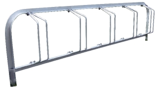 Cykelställ för nedgjutning, 5 platser. En enkel svetsad modell med vinkeljärnsram 35x35x3 mm som är förstärkt vid marknivå. Finns i höger, vänster och rak inkörning.