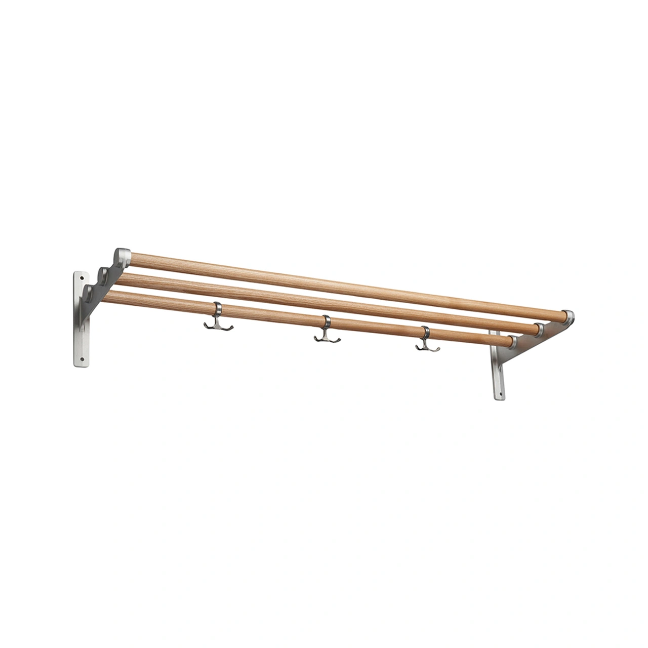 ESSEM DESIGN | Klädhylla lämplig för bostäder, kontor och offentliga lokaler. Hyllplan av rundstav i trä alt stål- eller aluminiumrör. Klädhyllan kan förlängas med hjälp av en påbyggnadsdel. Klädhyllan kan även användas som skohylla om ankarkrokarna tas bort.