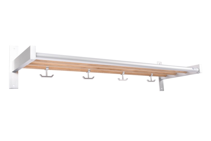 BYGGBESLAG | Klädhylla lämplig för bostäder och kontorslokaler. Konsoler i aluminium och hyllplan av rundstav i ek. Galgstång och krok i aluminium.