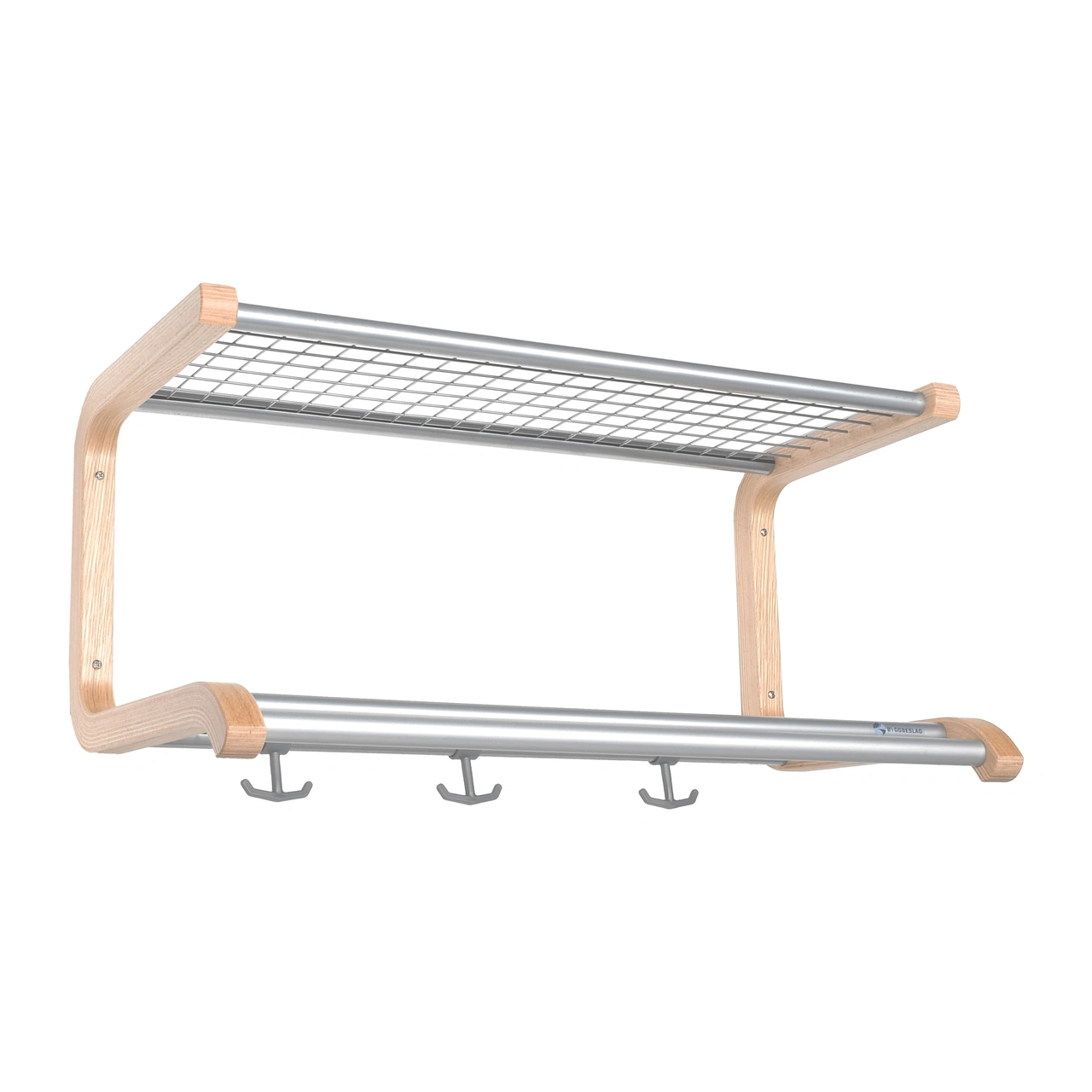 BYGGBESLAG | Dubbelhylla lämplig för bostäder och kontorslokaler. Konsoler i formpressad ek. Hyllnät finns i svart, vitt och grått. Galgstång i kromat stålrör till svart och vitt nät samt plastbelagd silverfärgad till grått nät. Levereras monterad. Returrätt gäller lagerförda varor, tillverkningsvara ej returrätt.