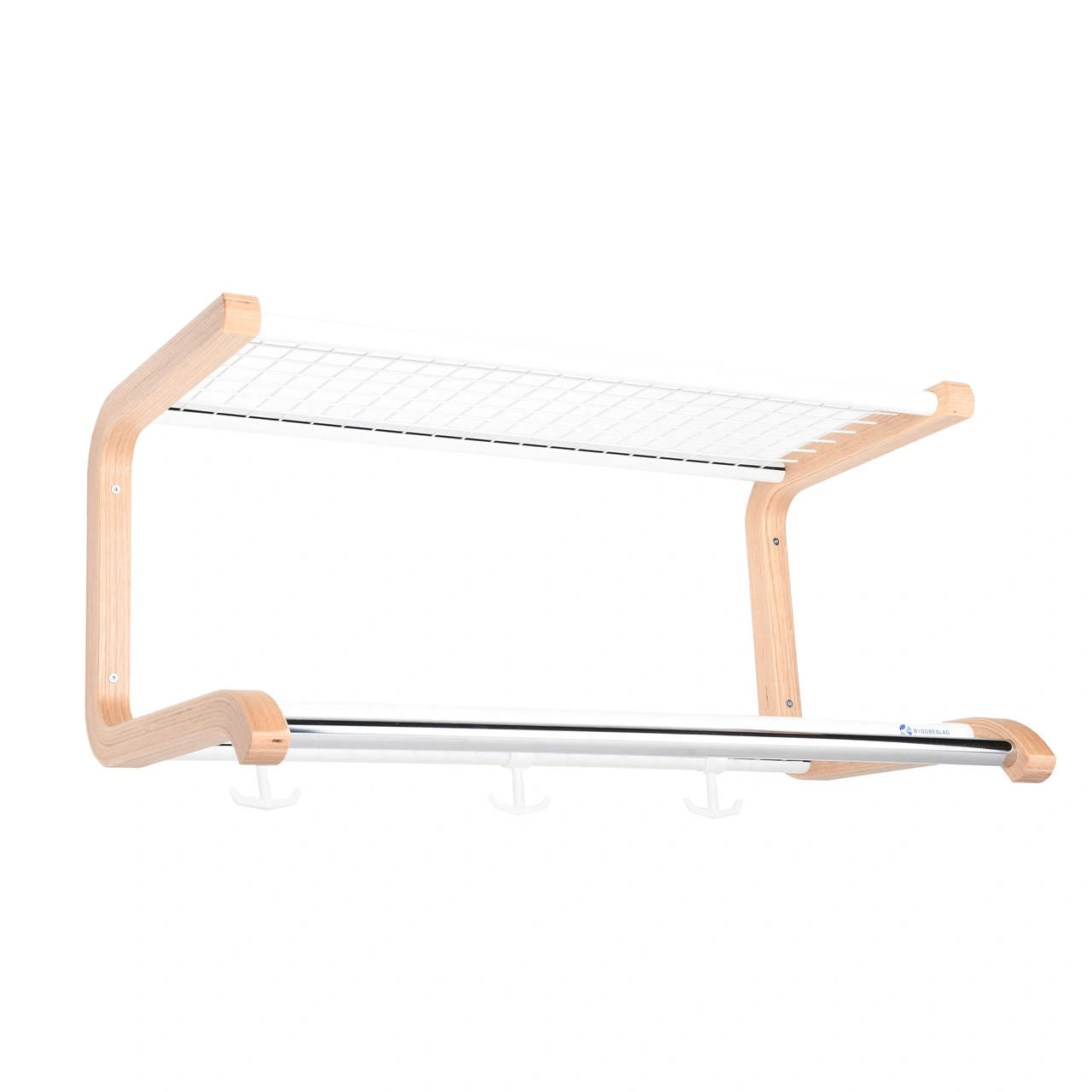 BYGGBESLAG | Dubbelhylla lämplig för bostäder och kontorslokaler. Konsoler i formpressad ek. Hyllnät finns i svart, vitt och grått. Galgstång i kromat stålrör till svart och vitt nät samt plastbelagd silverfärgad till grått nät. Levereras monterad. Returrätt gäller lagerförda varor, tillverkningsvara ej returrätt.