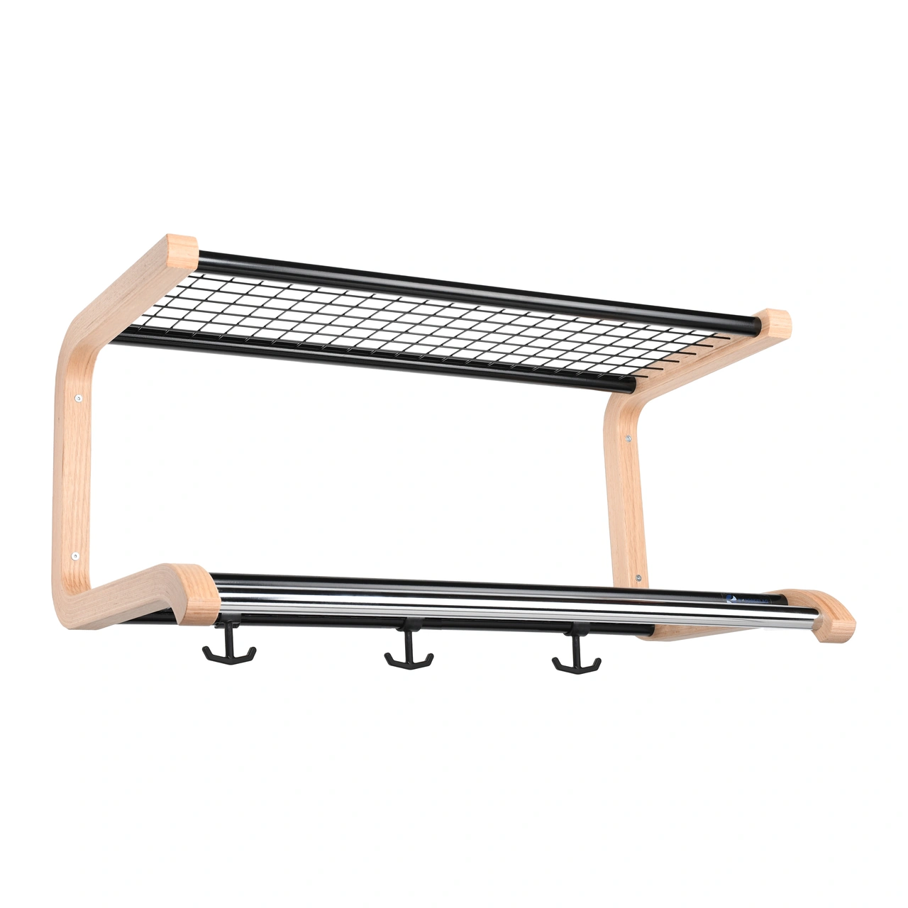 BYGGBESLAG | Dubbelhylla lämplig för bostäder och kontorslokaler. Konsoler i formpressad ek. Hyllnät finns i svart och galgstång i kromat stålrör. Levereras monterad. Returrätt gäller lagerförda varor, tillverkningsvara ej returrätt.