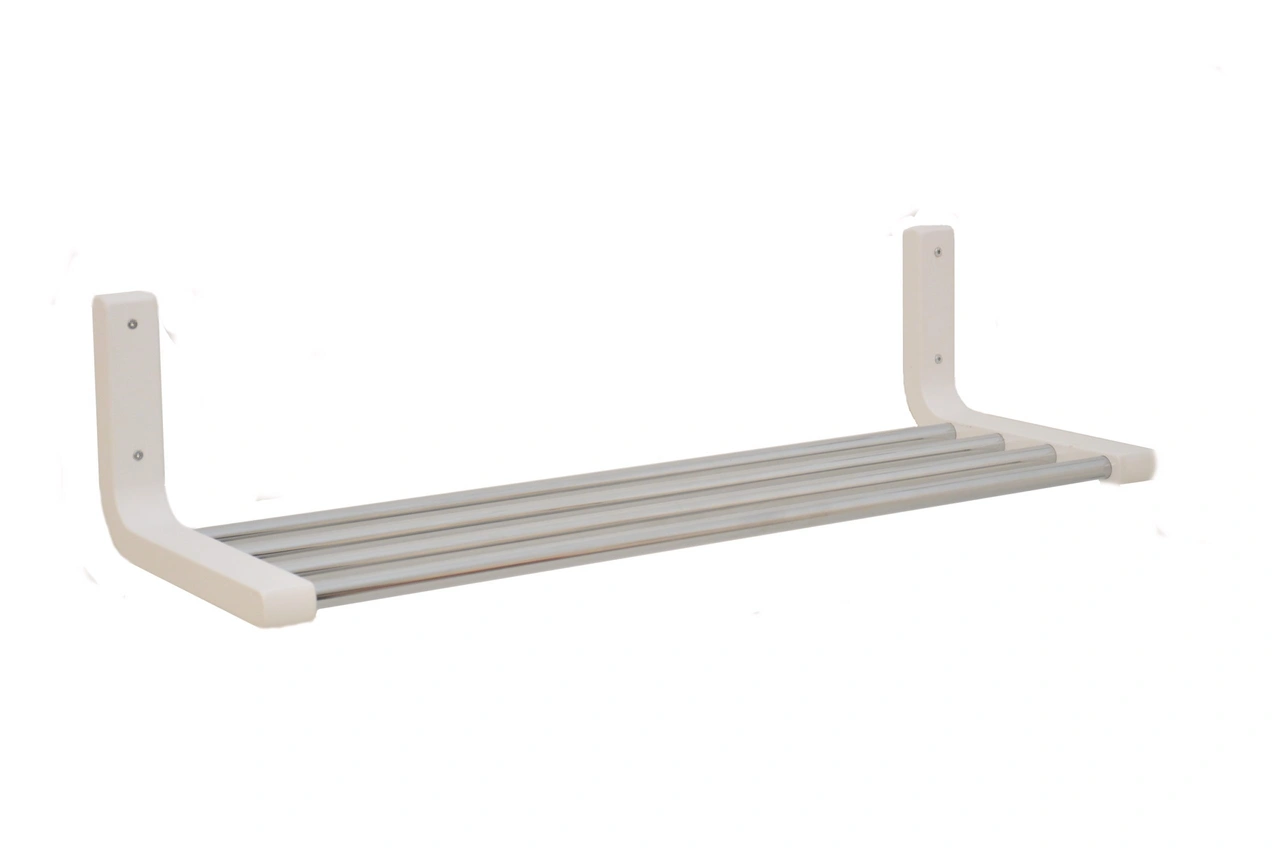 Skohylla med vitlackerade konsoler och hyllplan av blankkromade rör. Levereras monterad.