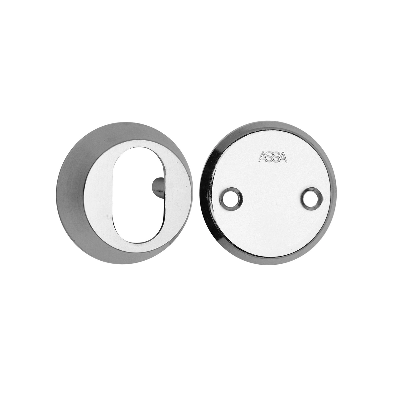 ASSA ABLOY | Cylinderbehör för yttre låsning samt dekorativ beslagning till dörrar där krav på godkänd låsning inte ställs. Cylinder på dörrens utsida och täckskylt för insidan. För montering tillsammans med oval enkelcylinder. Höjd på cylinderring och längd på skruv väljs beroende av dörrtjocklek, förnicklad.