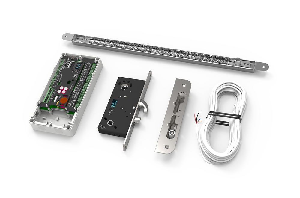 Satsförpackning innehåller: motorlås, styrenhet, anslutningskabel, slutbleck 106-2 och karmöverföring CT81.
