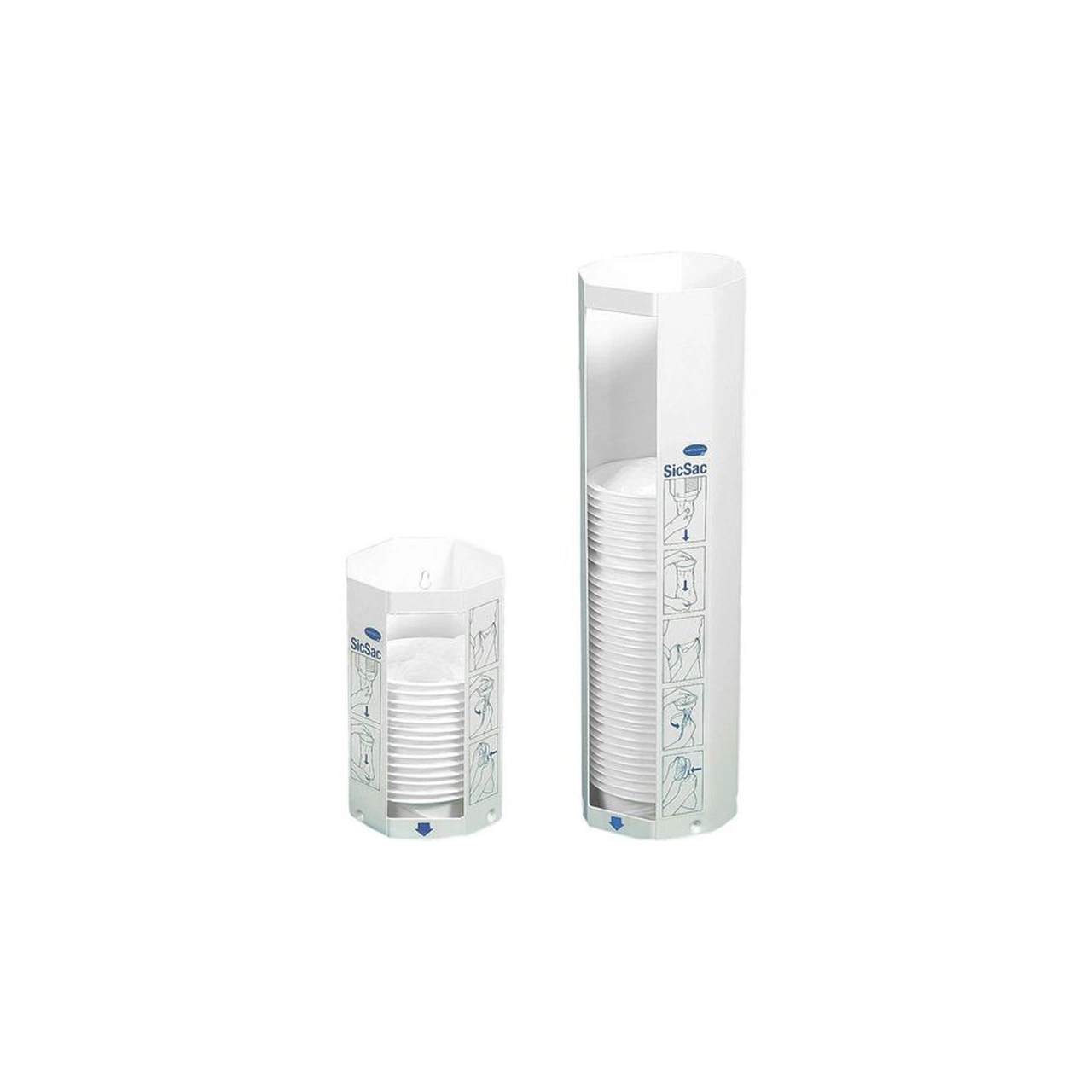 Väggmonterad dispenser för Sic Sac kräkpåsar. Den större modellen rymmer 50 st påsar och den mindre modellen ca 25 st.