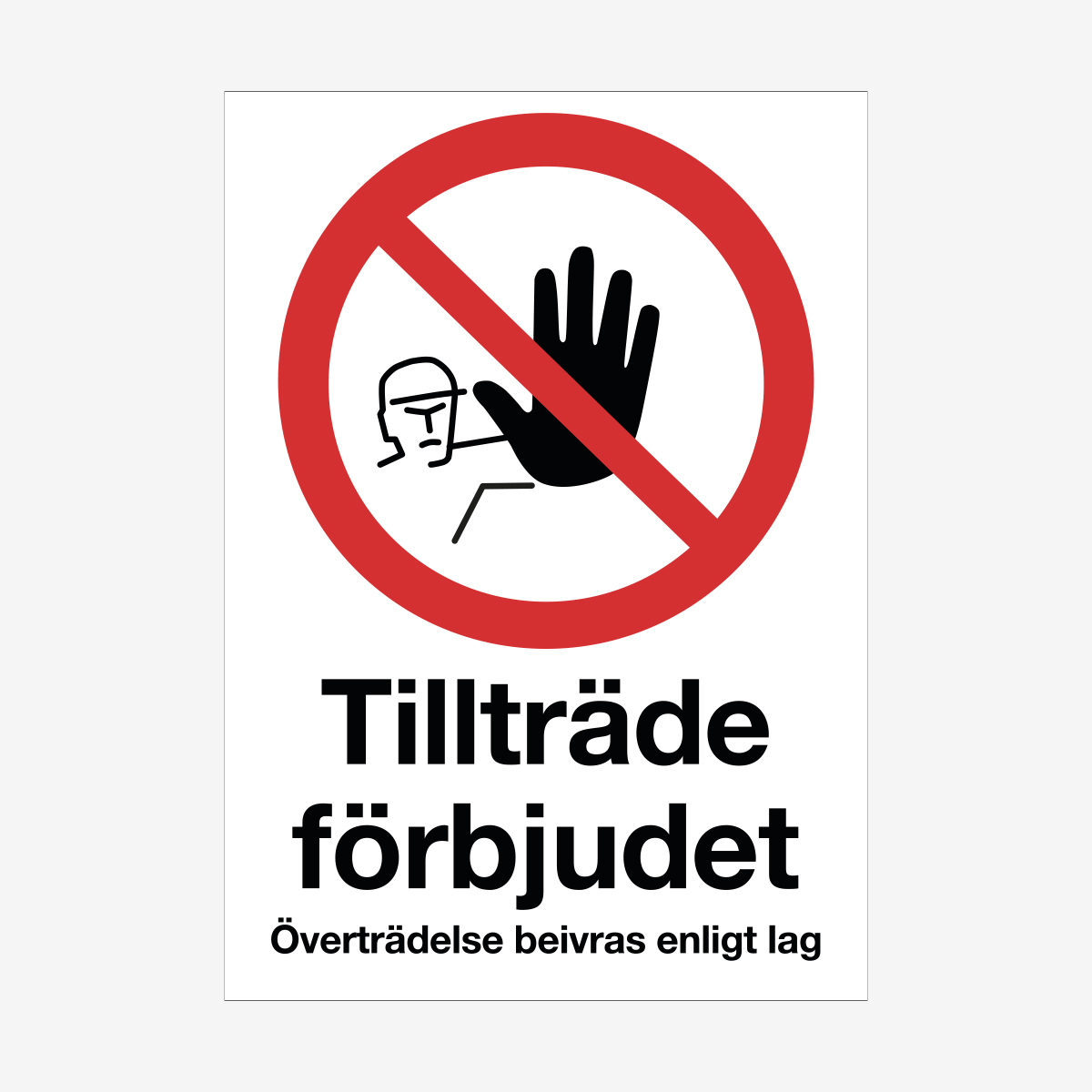 Informativ och tydlig förbudsskylt gällande tillträde förbjudet överträdelse beivras enligt lag i slitstark Apet plast. Skylten är utformad enligt myndighetskrav för förbudsskyltar (AFS 2020:1). Levereras utan hål eller tejp.