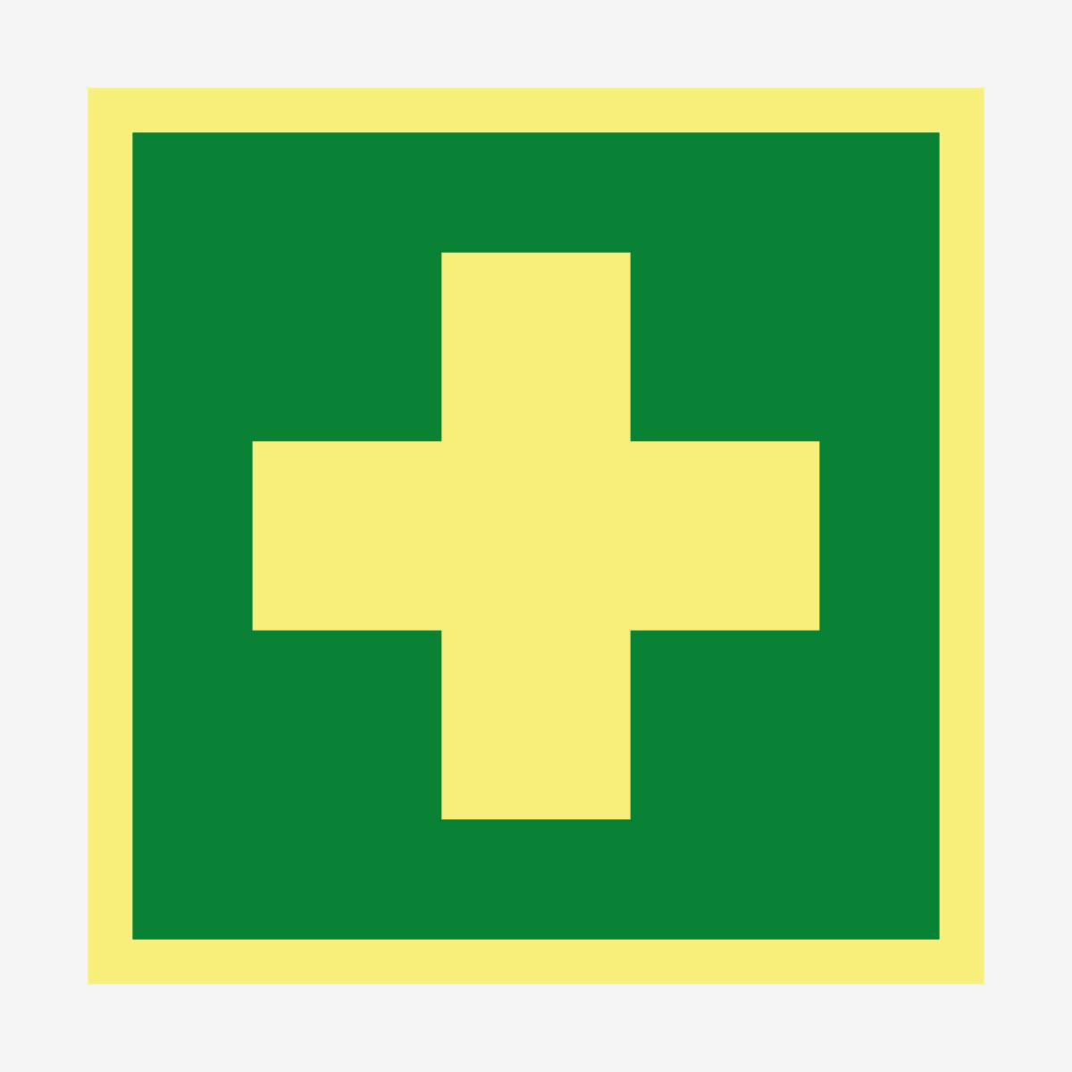 Tydlig nödskylt i efterlysande MEGA-kvalité för informerande om att första hjälpen finns vid skylten. Skylten är utformad enligt standarden ISO 7010, symbolbeteckning E011. En slittålig skylt med lång hållbarhet som levereras utan hål eller tejp.