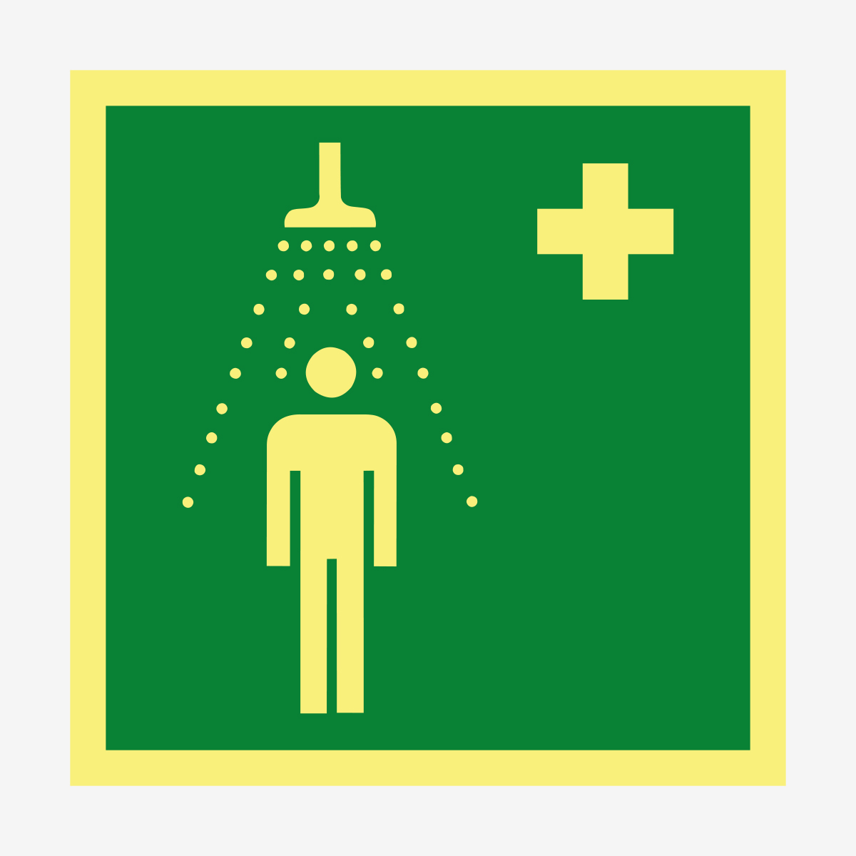 Tydlig nödskylt i efterlysande MEGA-kvalité för informerande om att nöddusch finns vid skylten. Skylten är utformad enligt standarden ISO 7010, symbolbeteckning E011. En slittålig skylt med lång hållbarhet som levereras utan hål eller tejp.