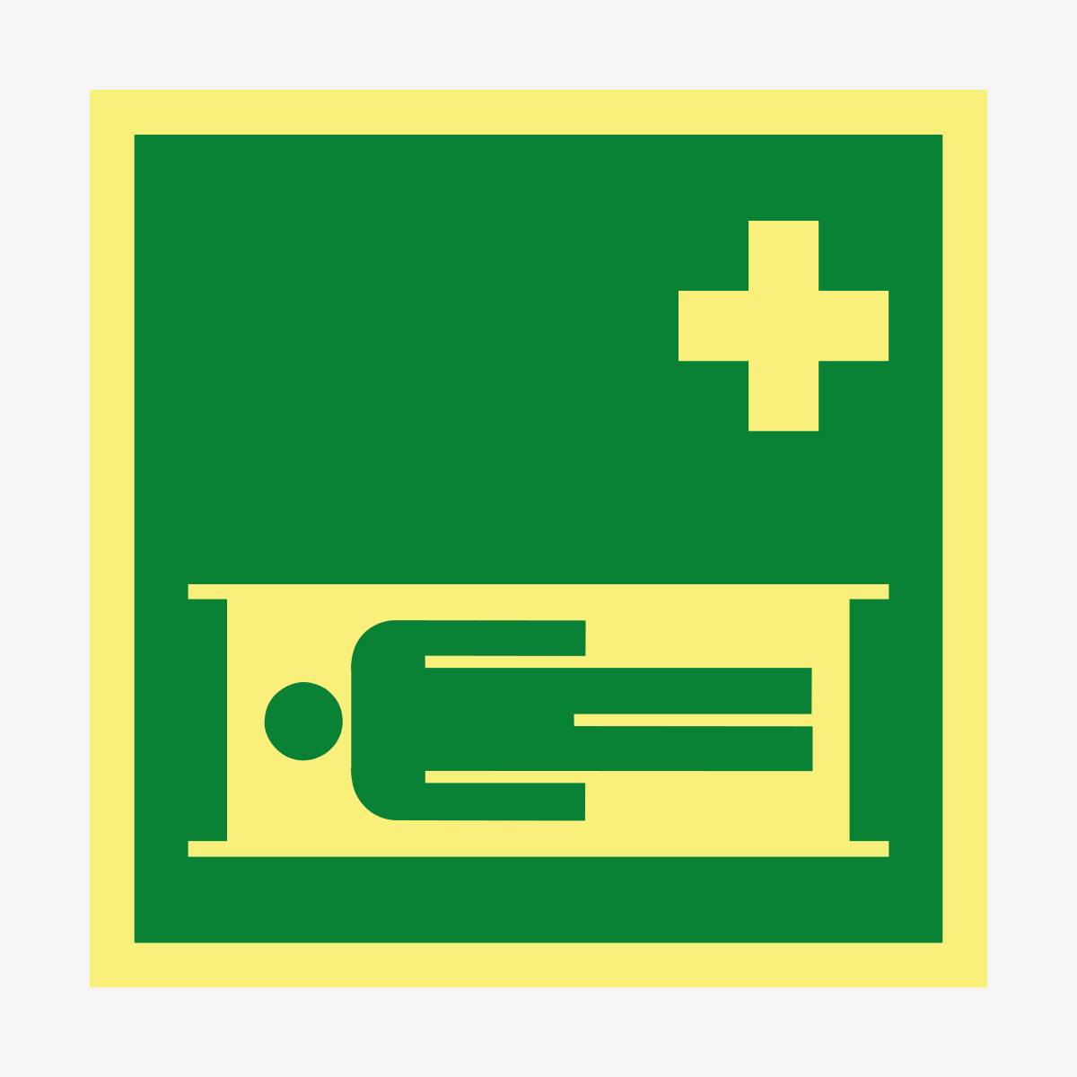 Tydlig nödskylt i efterlysande MEGA-kvalité för informerande om att sjukbår finns vid skylten. Skylten är utformad enligt standarden ISO 7010, symbolbeteckning E011. En slittålig skylt med lång hållbarhet som levereras utan hål eller tejp.