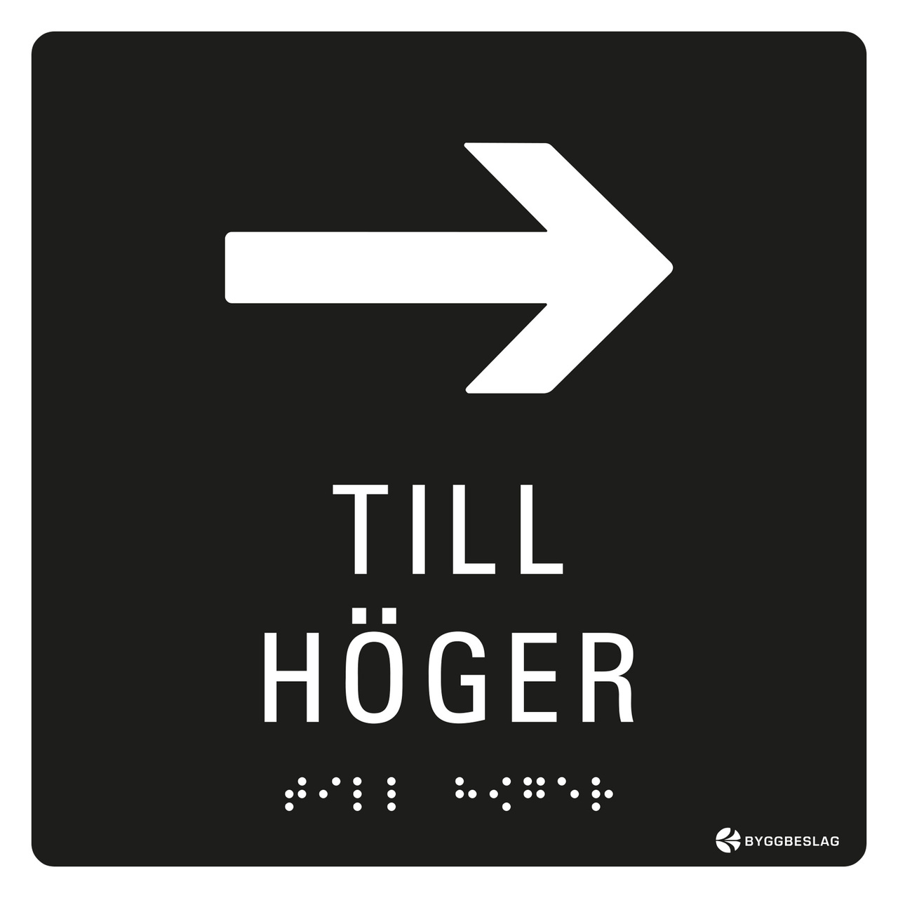 SKYLT TAKTIL PIL HÖGER 150X150 HÅL SVART MED VIT TEXT