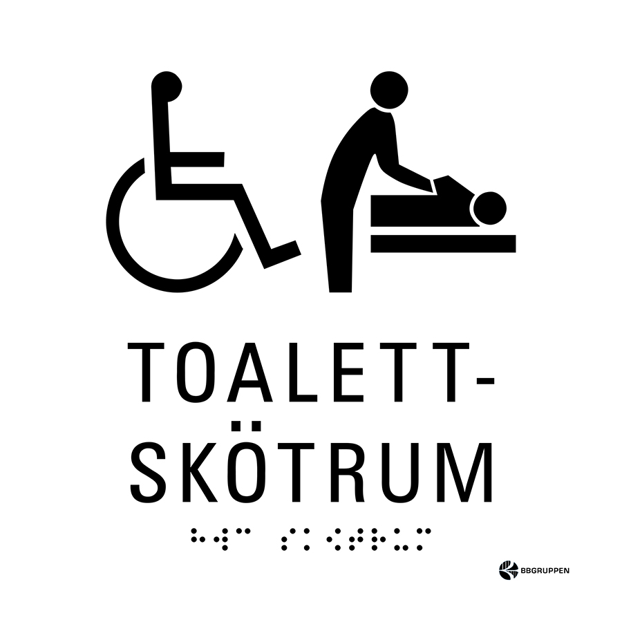 Taktil skylt för synskadade med rundade hörn. Skylten har ett piktogram kombinerat med text. Symbolerna är designade för optimal läsbarhet. Texten är skriven med upphöjd text med kompletterande punktskrift. Dubbelhäftande tejp för flexibel placering.