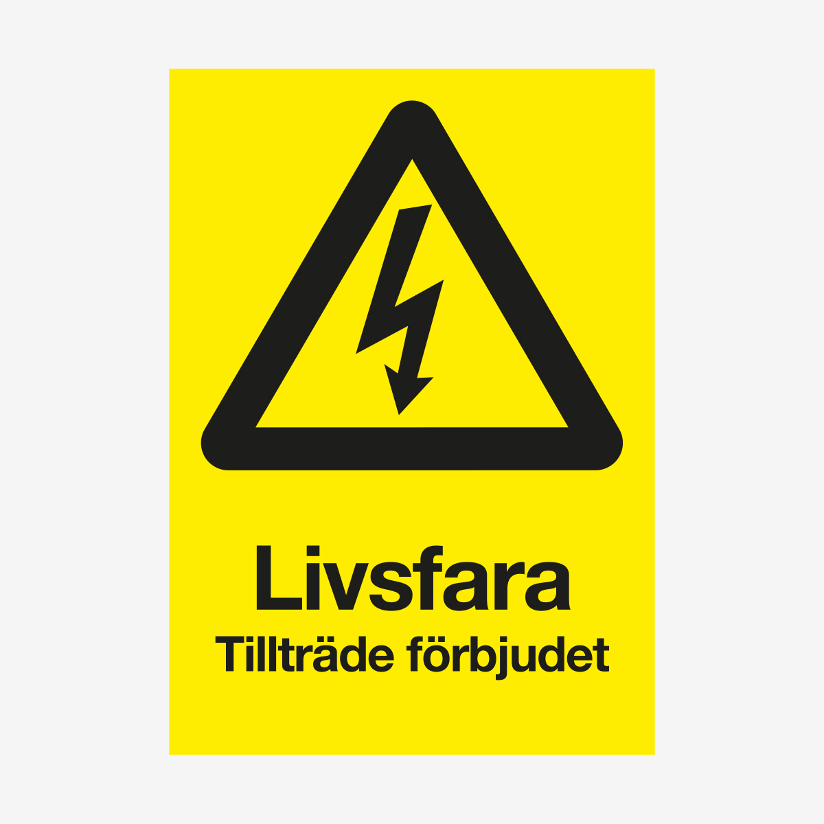 Varningsskylt i aluminium som tydlig informerar om livsfara, tillträde förbjudet. Skylten är utformad enligt myndighetskrav för varningsskyltar (AFS 2020:1). En skylt som är slitstark med lång hållbarhet. Gul bottenfärg och symbol samt text i svart. Skylten levereras utan hål eller tejp.